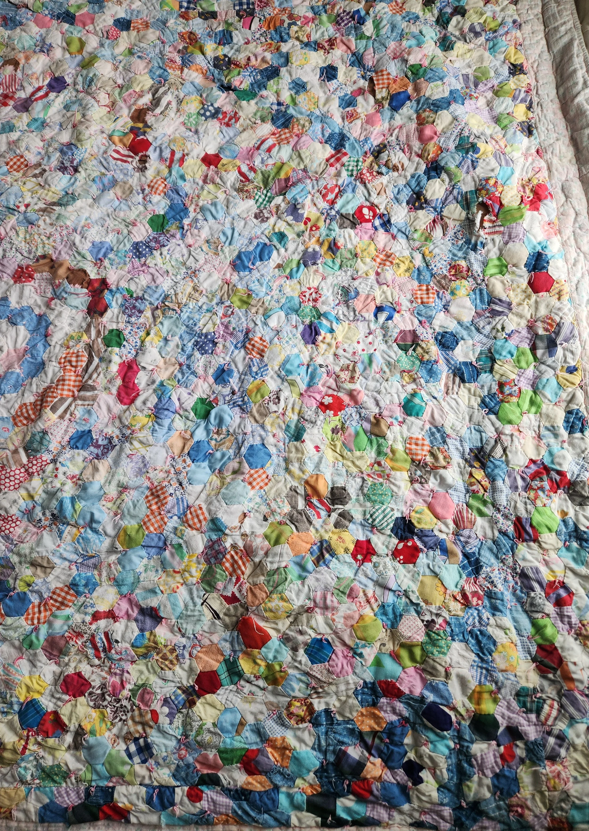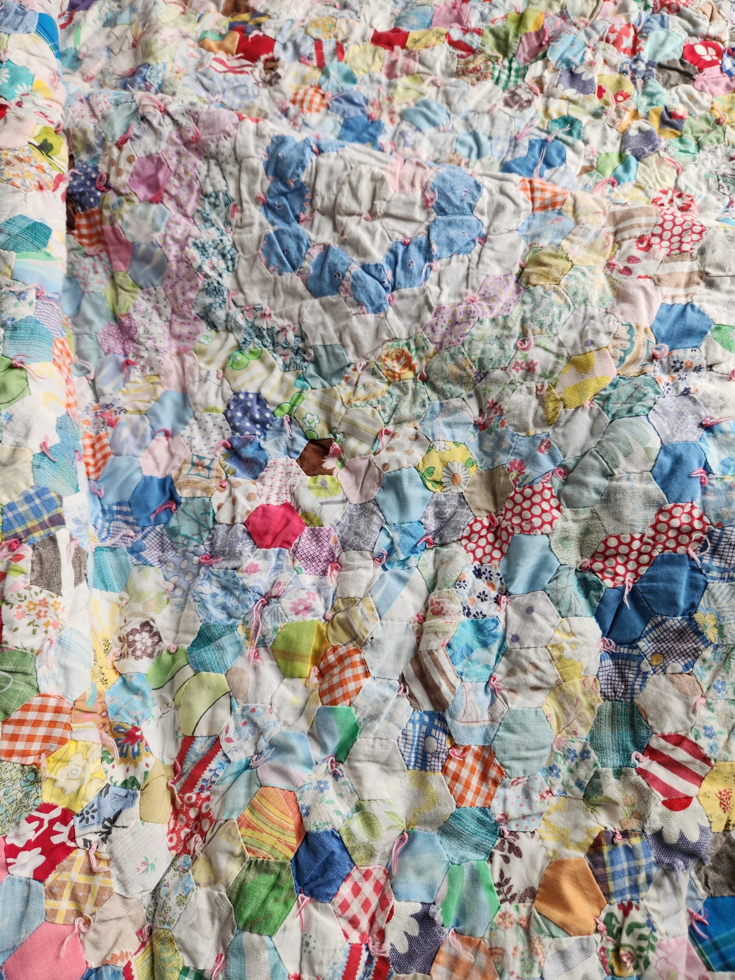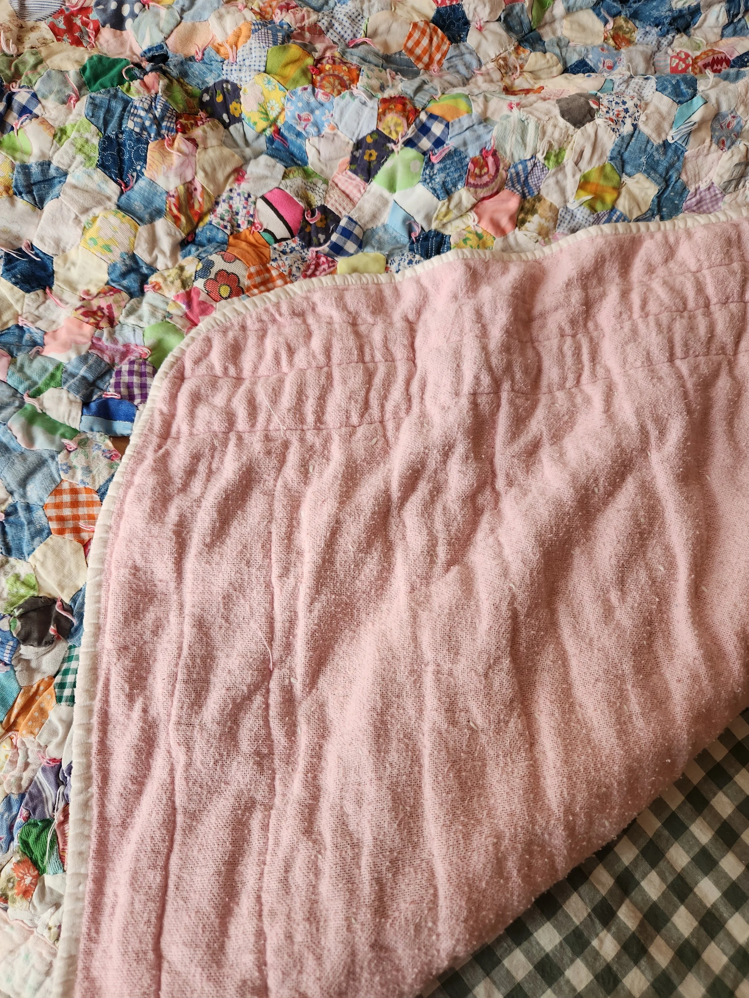 2025 › Vintage small Hexi quilt charming hand knotted comfortor pink flannel backing clean and so cozy! 55x70 Image 1 of 6 Image 2 of 6 Image 3 of 6 Image 4 of 6 Image 5 of 6 Image 6 of 6 Vintage small Hexi quilt charming hand knotted comfortor pink flannel backing clean and so cozy! 55x70 $98.00 Sold Out Sold Out Added!