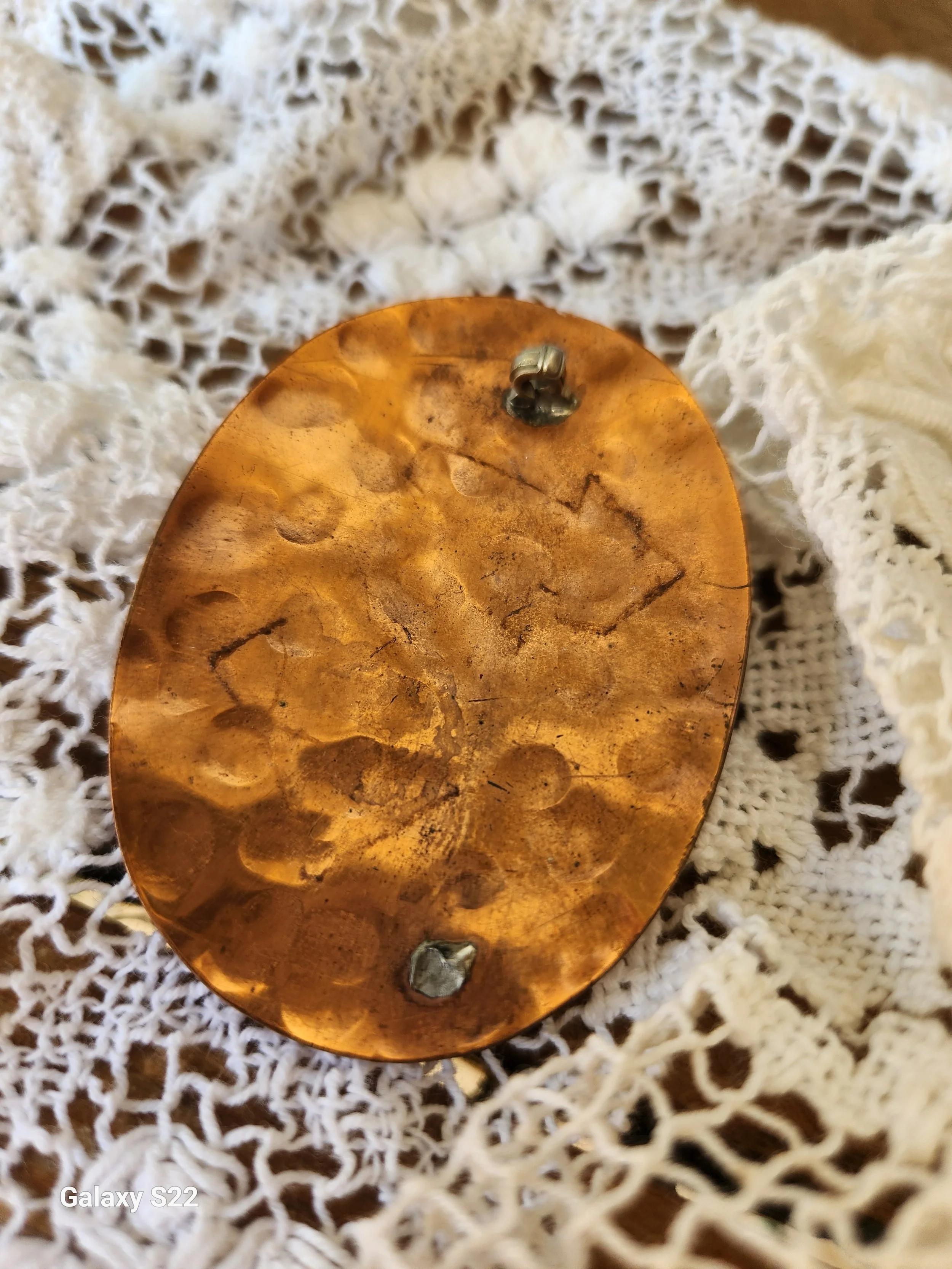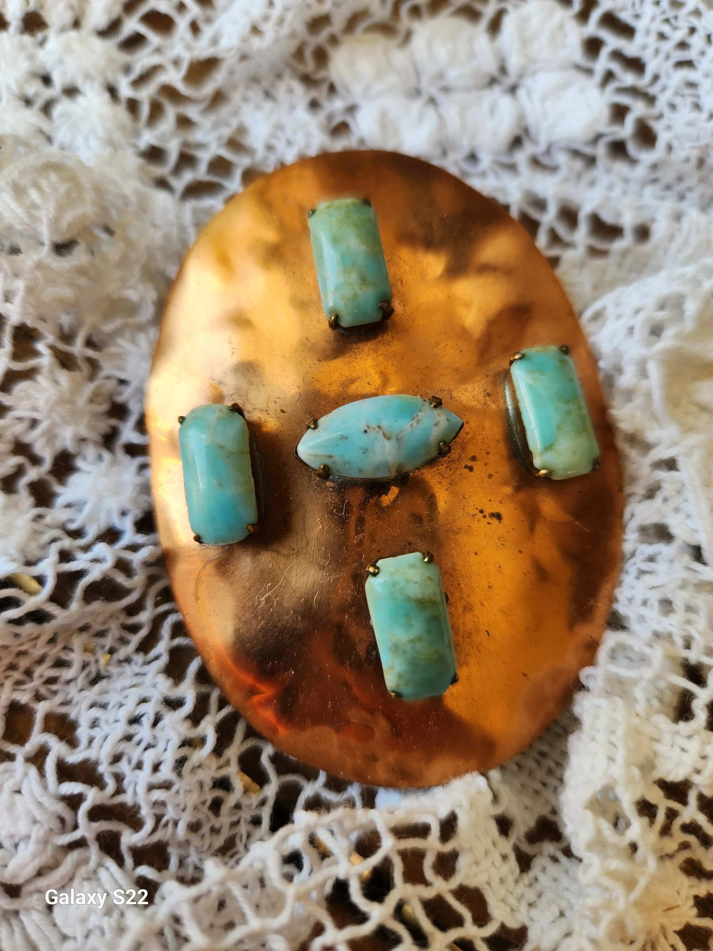 Shoppe › Vintage copper and turquoise brooch/necklace Image 1 of 2 Image 2 of 2 Vintage copper and turquoise brooch/necklace $26.00 This is such a pretty piece! Heavy hand hammered copper can be hung on a chain or used as a brooch! 3x3 Add To Cart Added! This is such a pretty piece! Heavy hand hammered copper can be hung on a chain or used as a brooch! 3x3 Reviews Reviewer Name Review Date Star Rating Description Posted on Etsy Product Show More
