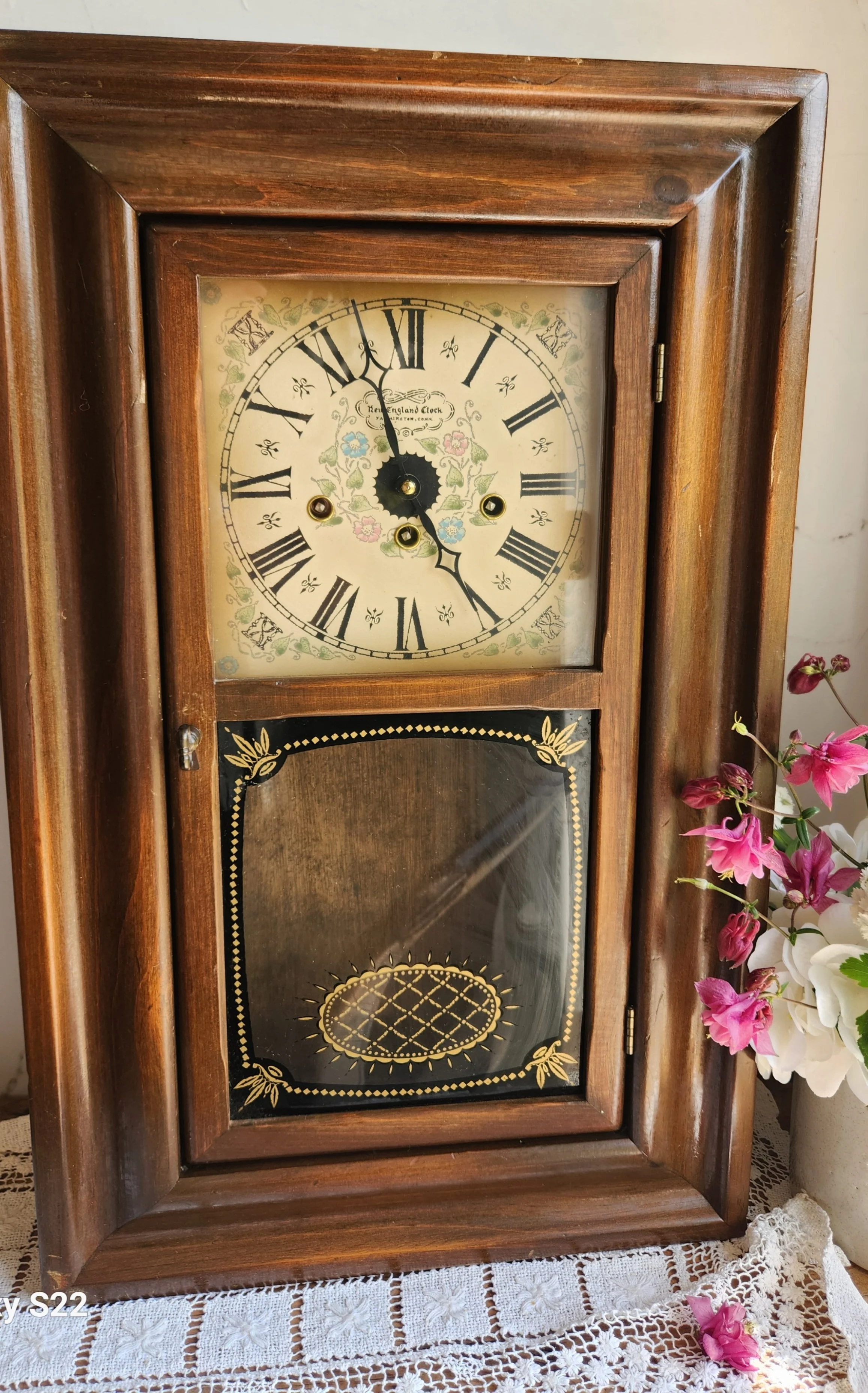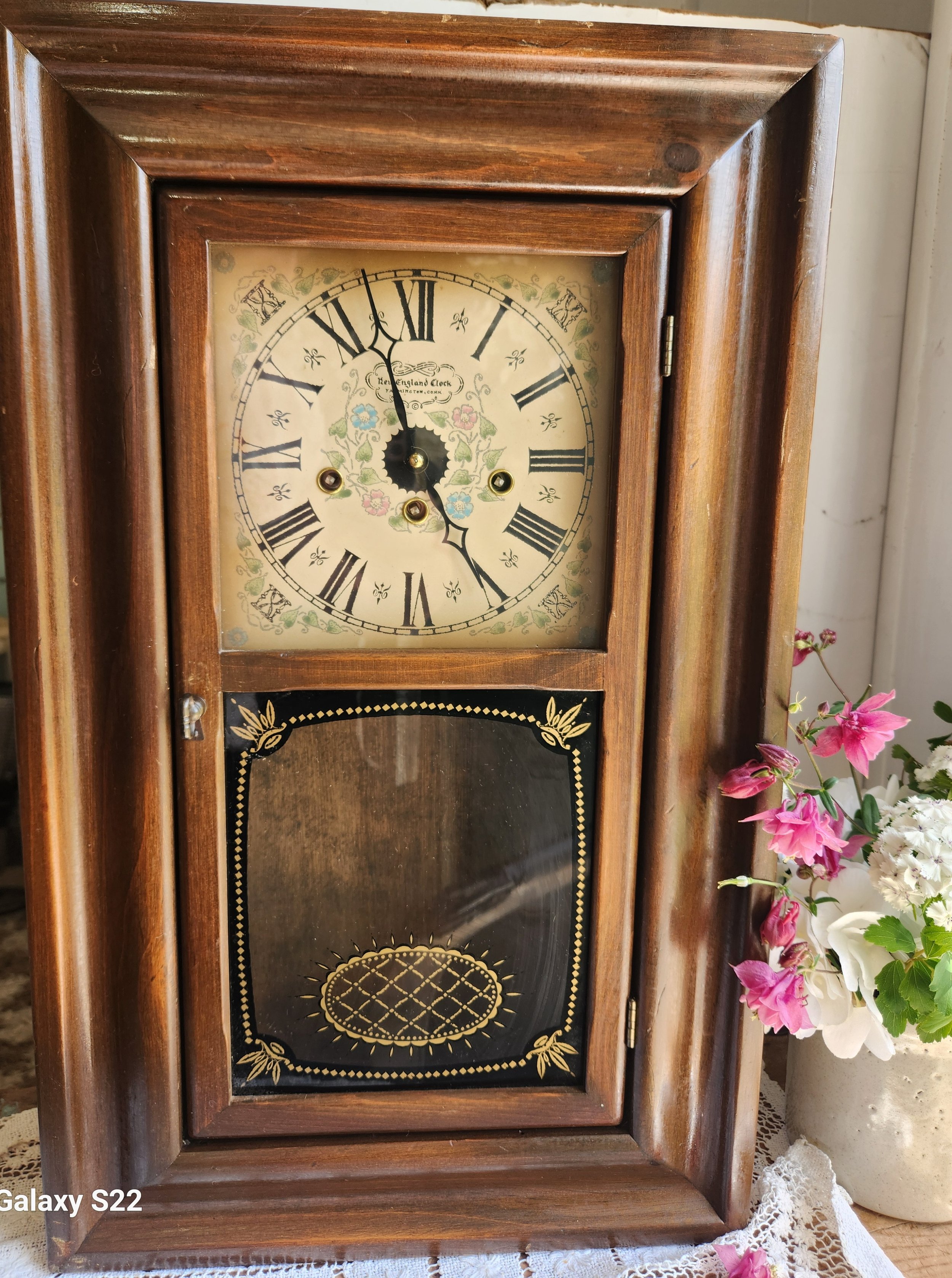 This clock is a dream! Fully working with key and solid wood has lower glass where you can put your art work of choice! 5x15x24