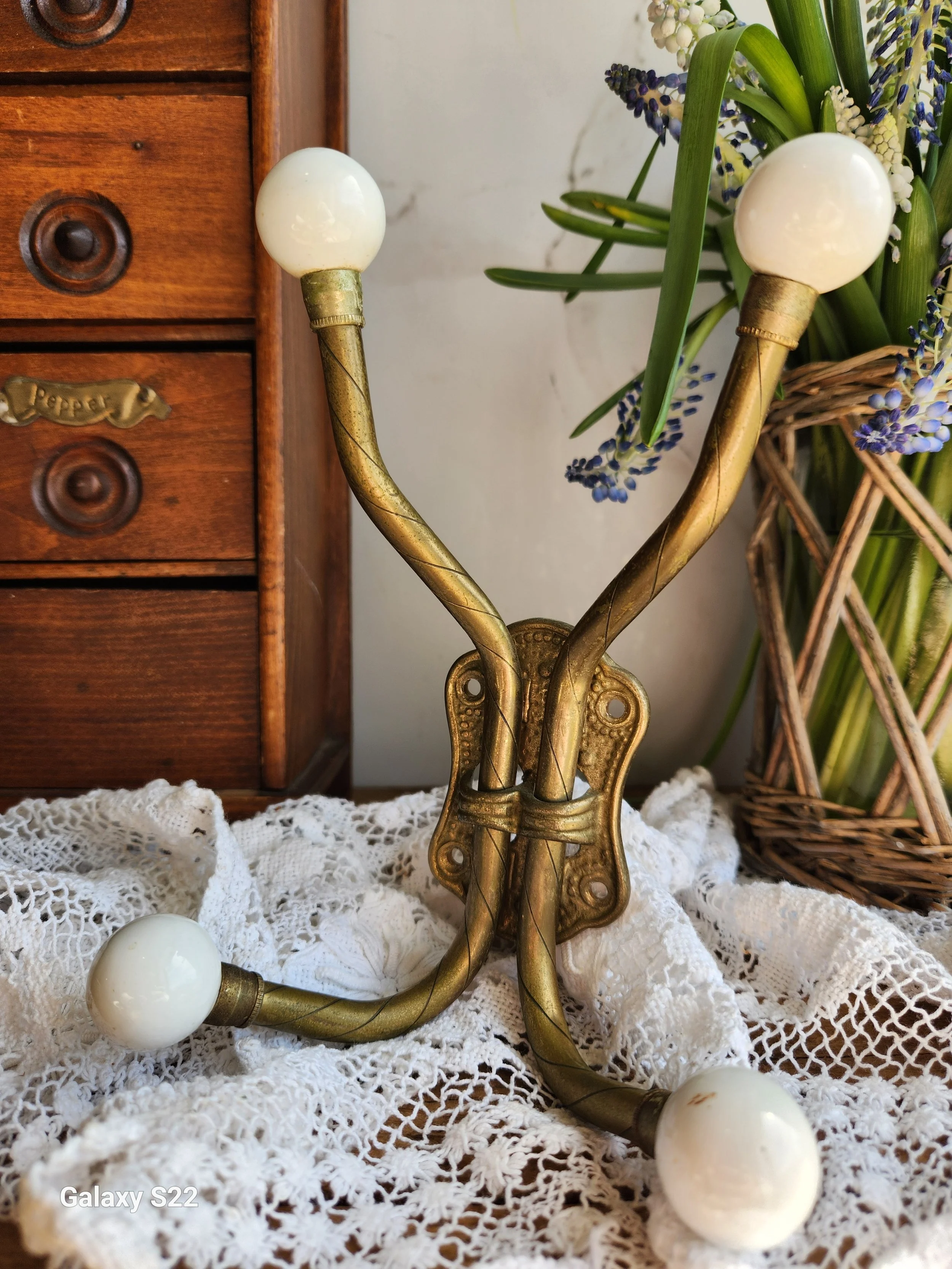 Shoppe › Rare double brass hook Image 1 of 1 Rare double brass hook $59.00 This piece is pure perfection! Double brass and porcelain wall hook! 6x8 Add To Cart Added! This piece is pure perfection! Double brass and porcelain wall hook! 6x8 Reviews Reviewer Name Review Date Star Rating Description Posted on Etsy Product Show More
