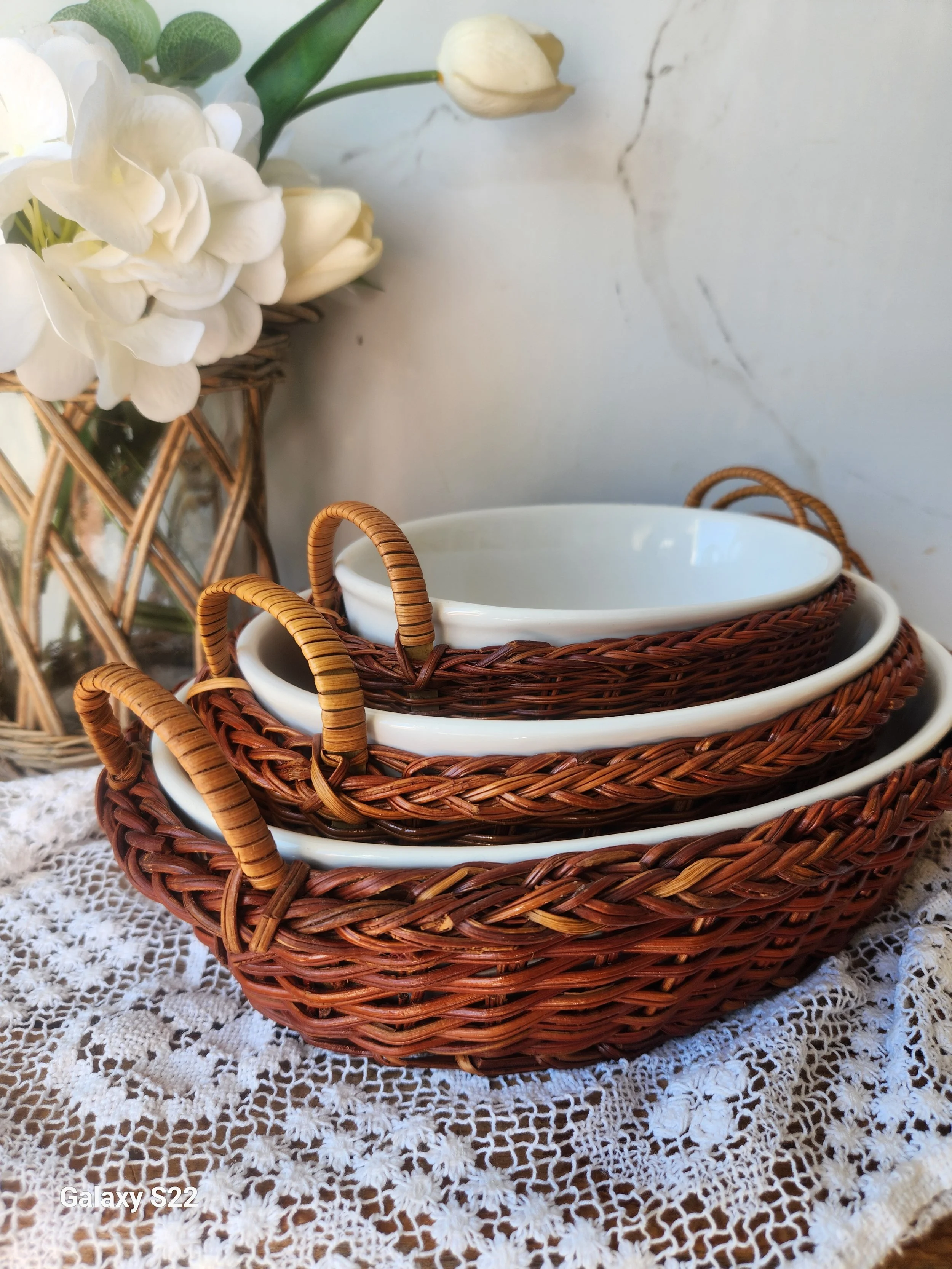 Shoppe › Vintage set of baking dishes with original baskets Image 1 of 2 Image 2 of 2 Vintage set of baking dishes with original baskets $69.00 Sold Out These are so classic! They are actually part of my personal collection! Oven safe the white dishes are 8”,10”,13” Sold Out Added! These are so classic! They are actually part of my personal collection! Oven safe the white dishes are 8”,10”,13” Reviews Reviewer Name Review Date Star Rating Description Posted on Etsy Product Show More