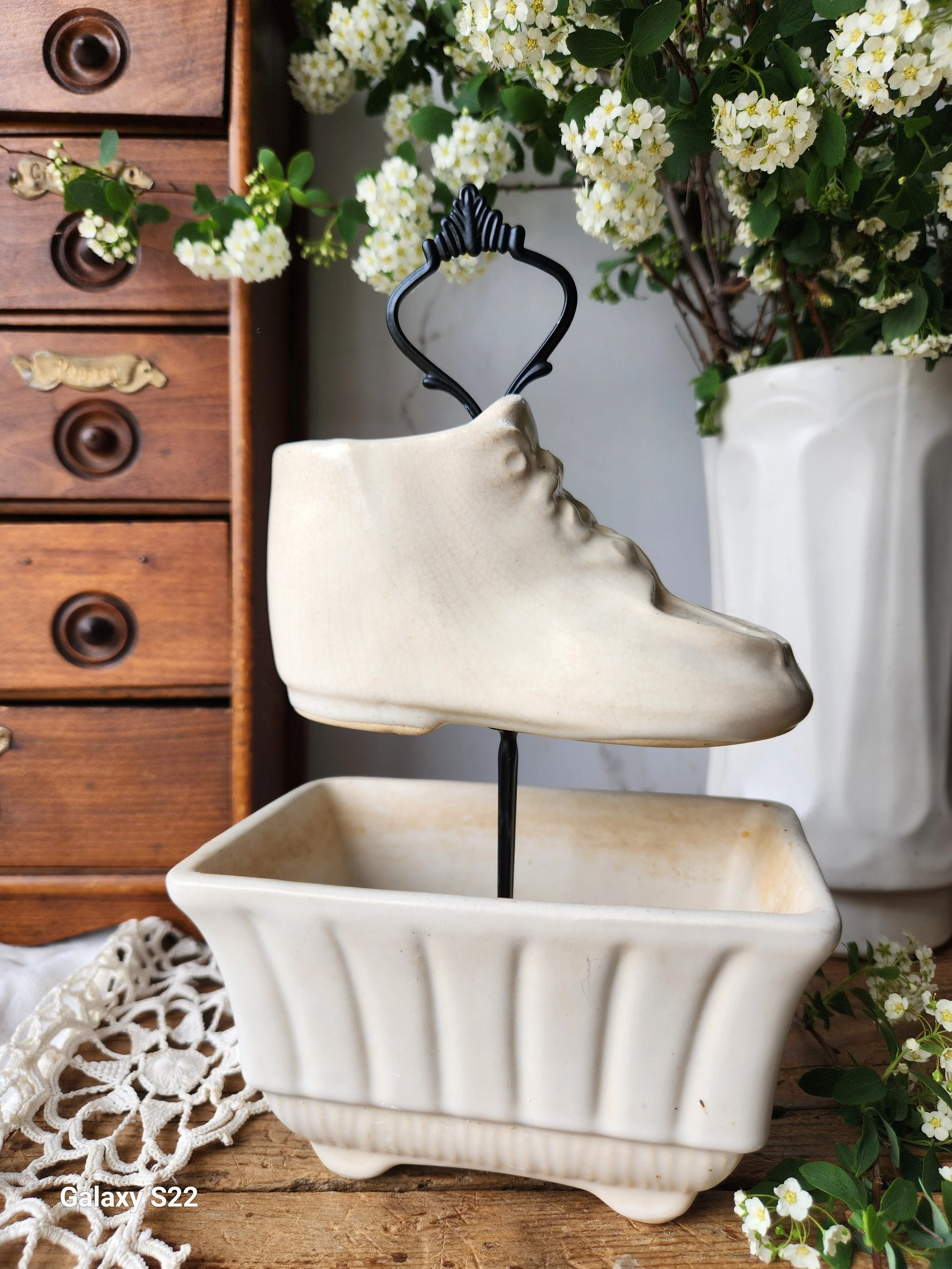 I designed this set! Using vintage pottery planters perfect to give as a baby gift! Add plants, or changing table essentials! 4x6x10