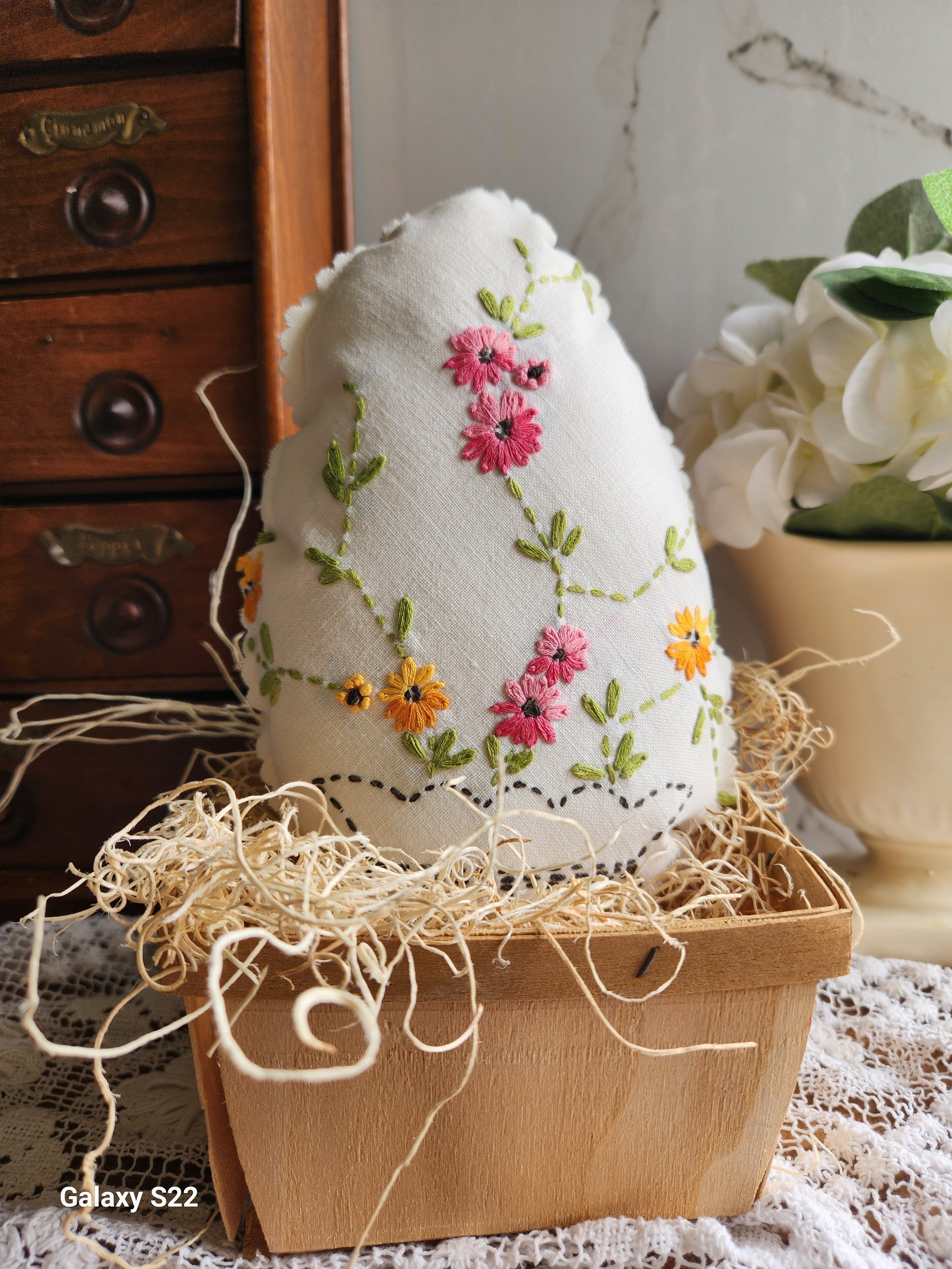 hand sewn from vintage linens these are charming eggs filled with soft poly fill, perfect for tuck into a basket, put under a cloche or use in vignette or shelf styling! Linen backing 7x9