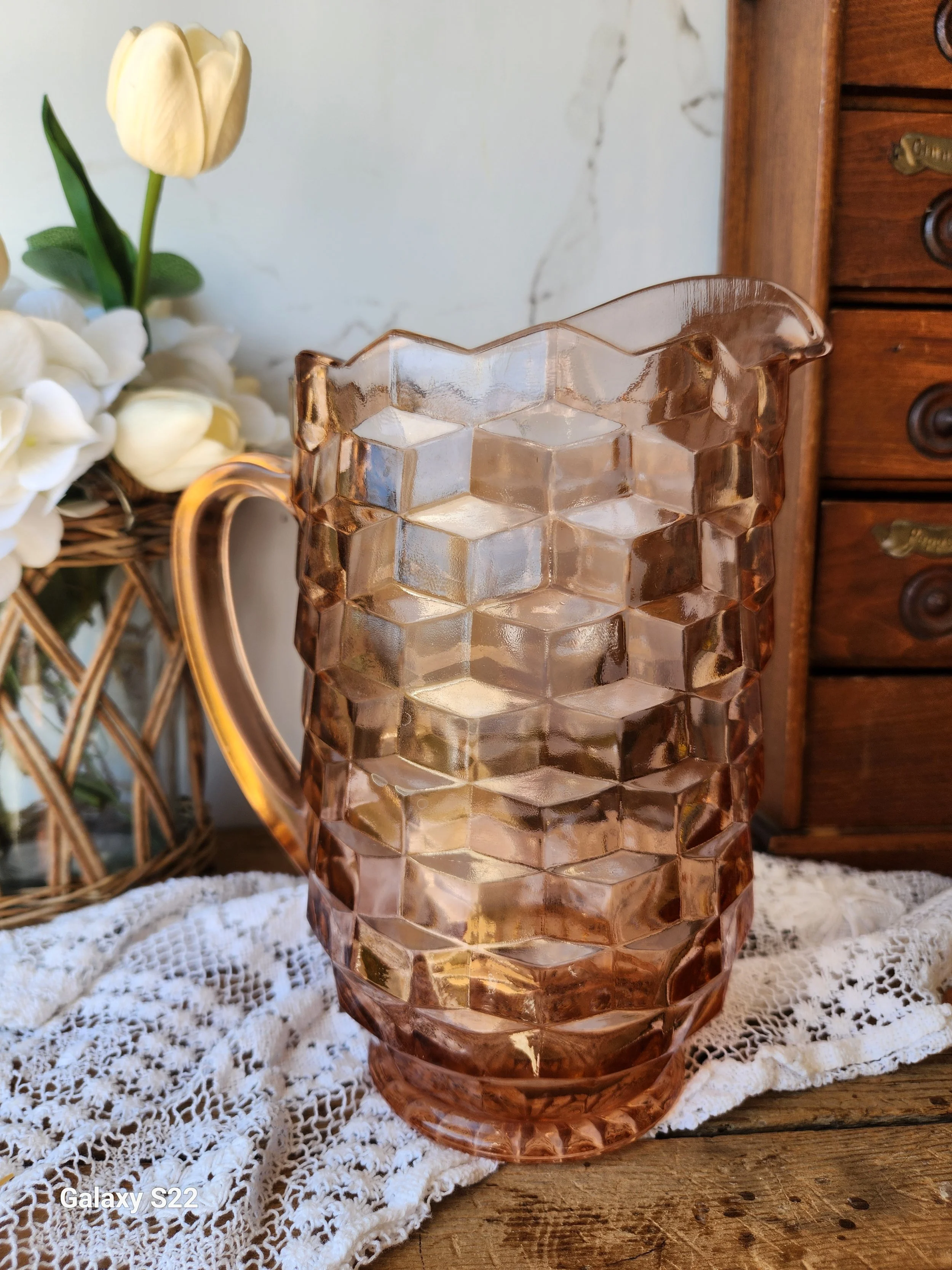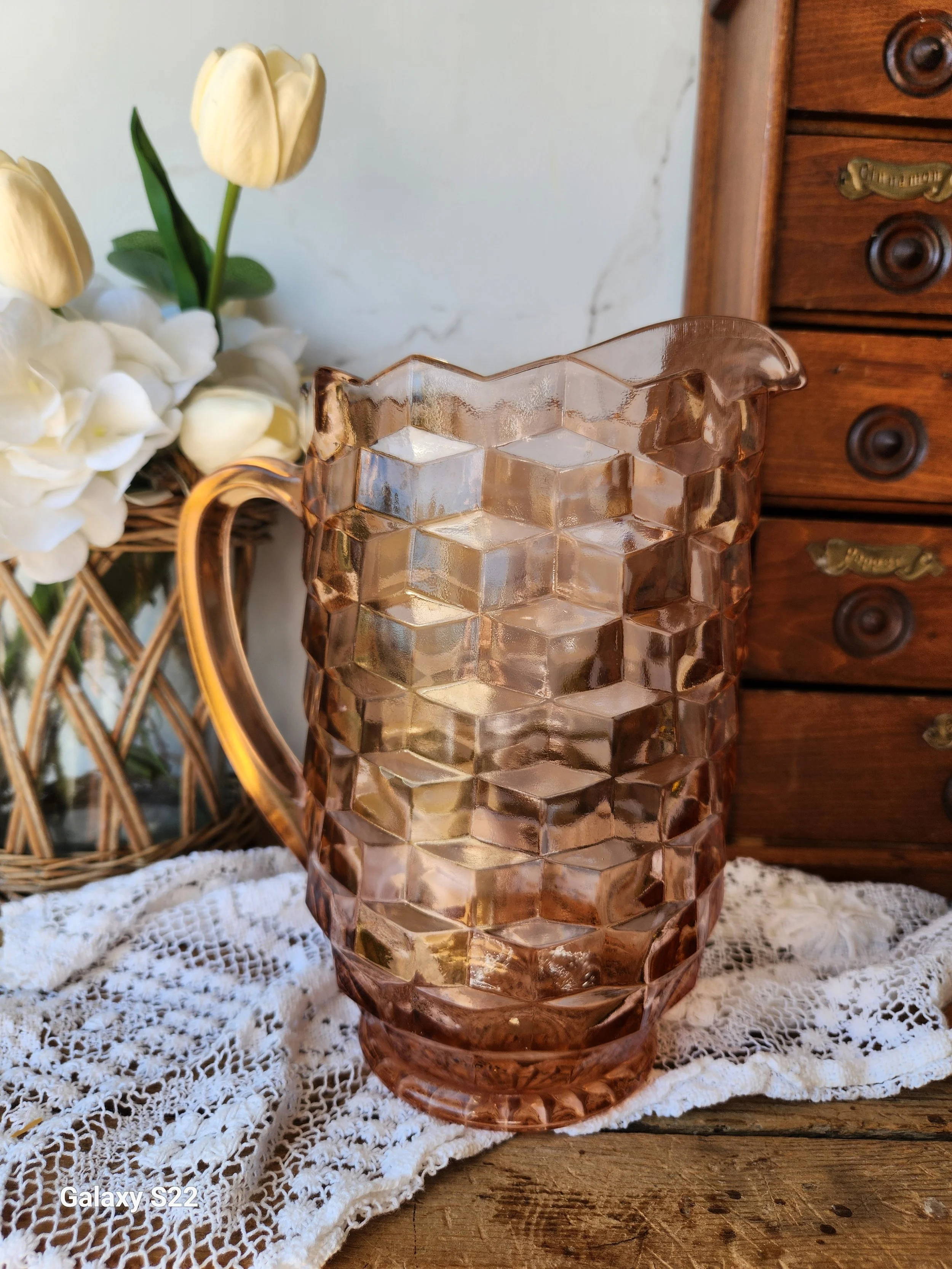 Shoppe › Vintage Pink whitehall Indiana glass pitcher Image 1 of 3 Image 2 of 3 Image 3 of 3 Vintage Pink whitehall Indiana glass pitcher $44.00 Soft pink no chips or cracks 9x9 Add To Cart Added! Soft pink no chips or cracks 9x9 Reviews Reviewer Name Review Date Star Rating Description Posted on Etsy Product Show More