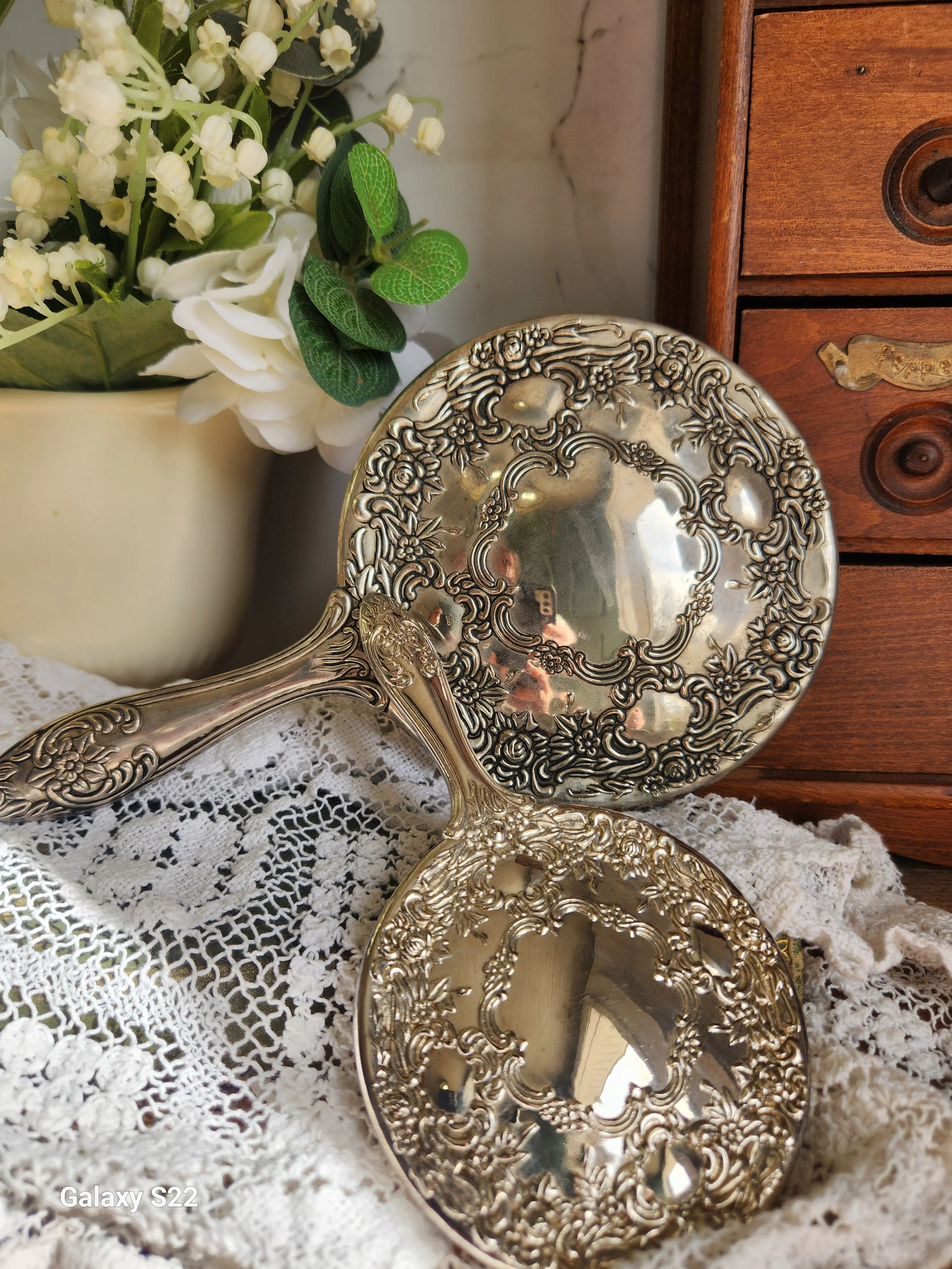 Shoppe › Antique Silver plate heavy mirror set Image 1 of 1 Antique Silver plate heavy mirror set $48.00 Sold Out A gorgeous set! Solid heavy and the mirrors are in excellent condition! A rare find 6x9.5, 3.5x6.5 Sold Out Added! A gorgeous set! Solid heavy and the mirrors are in excellent condition! A rare find 6x9.5, 3.5x6.5