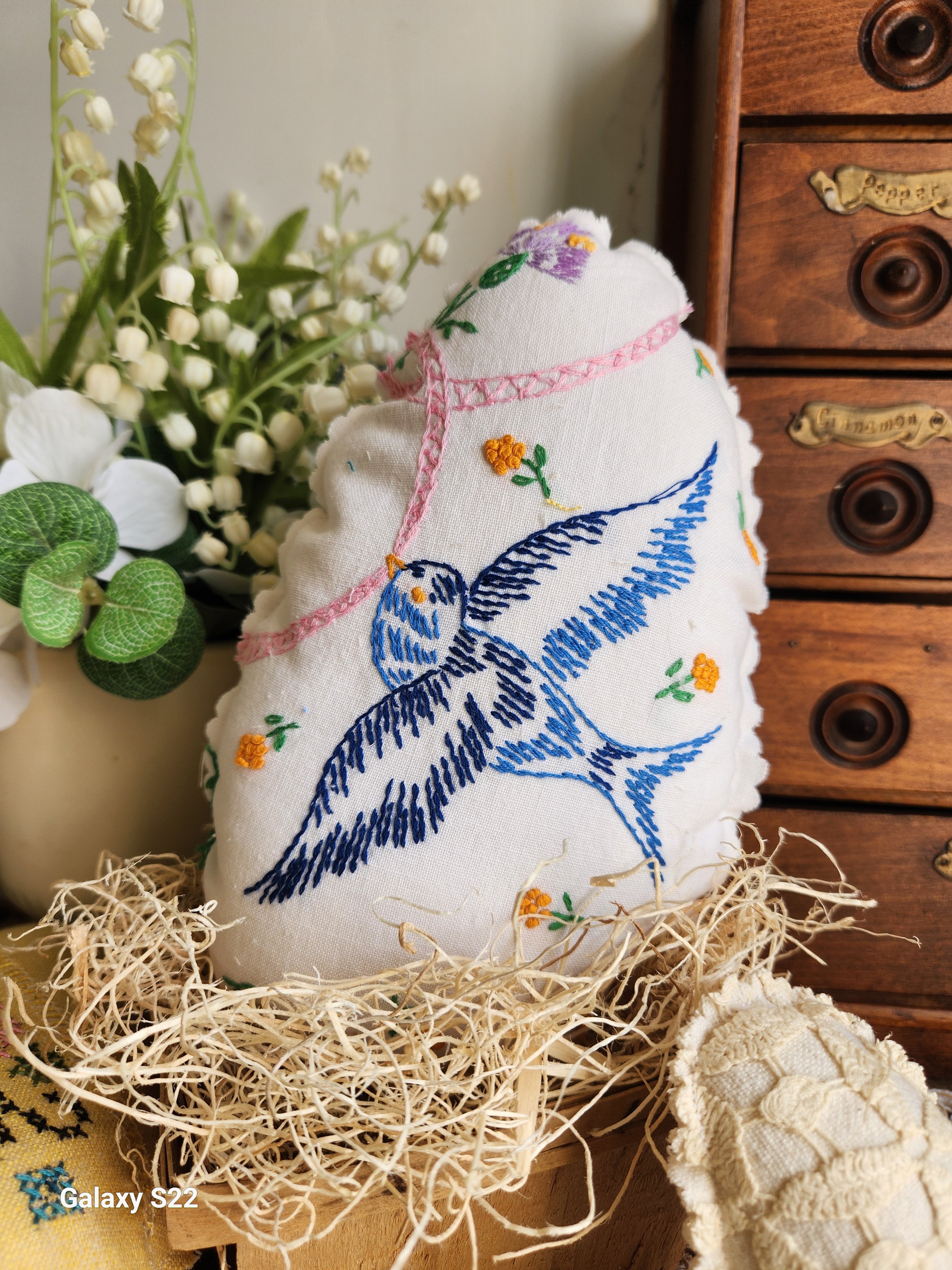 hand sewn from vintage linens these are charming eggs filled with soft poly fill, perfect for tuck into a basket, put under a cloche or use in vignette or shelf styling! Linen backing 7x9