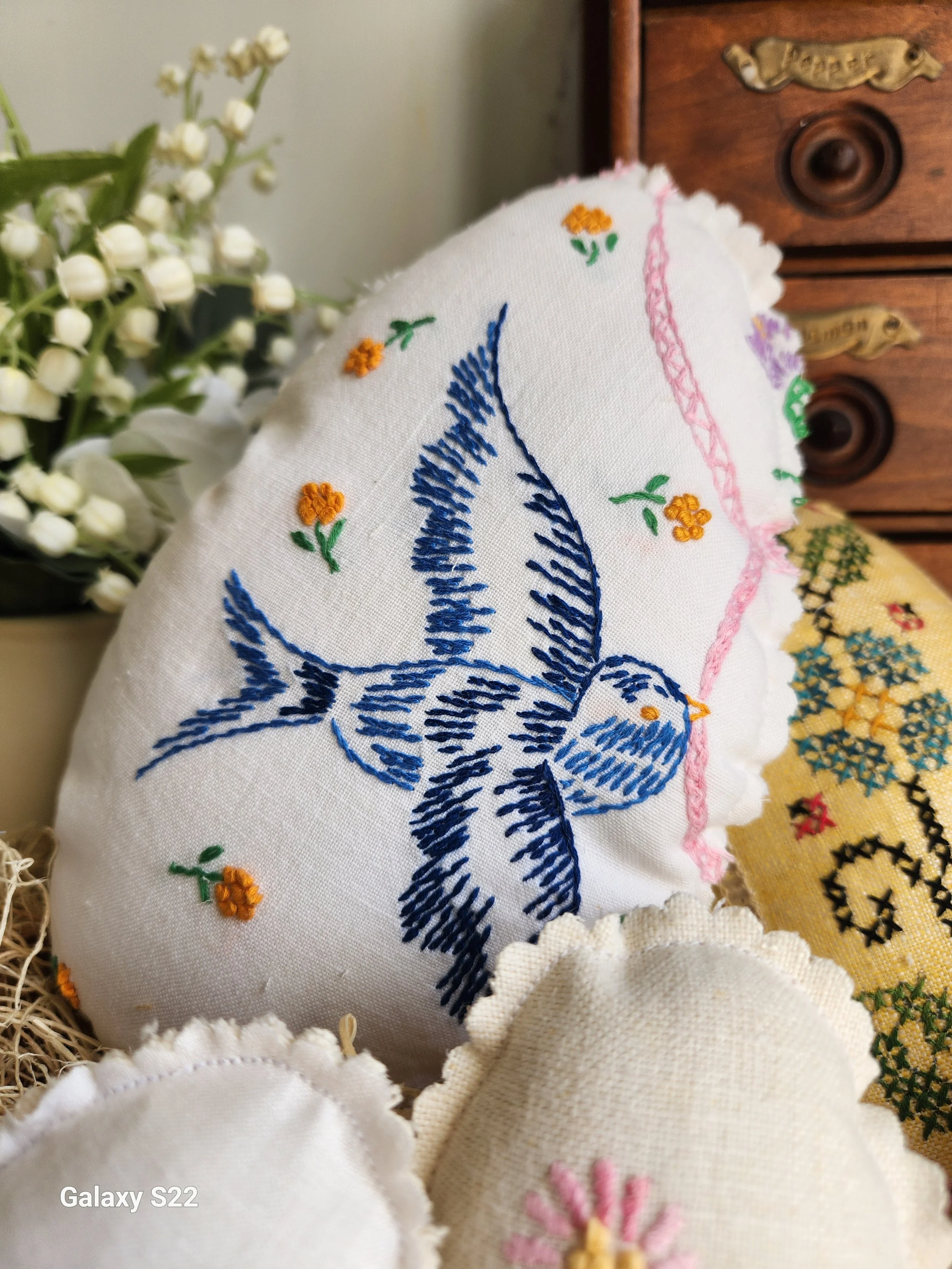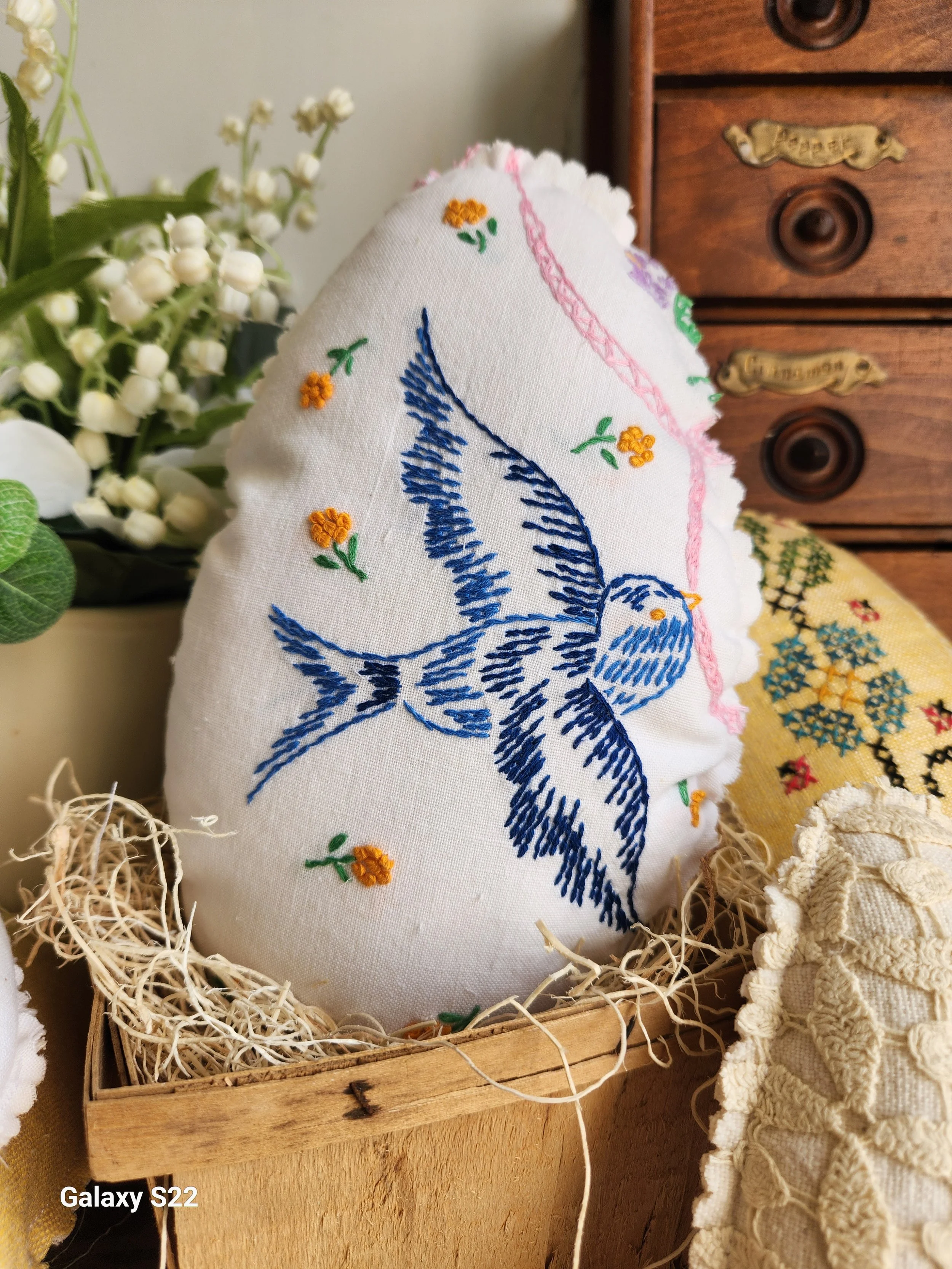 hand sewn from vintage linens these are charming eggs filled with soft poly fill, perfect for tuck into a basket, put under a cloche or use in vignette or shelf styling! Linen backing 7x9.5