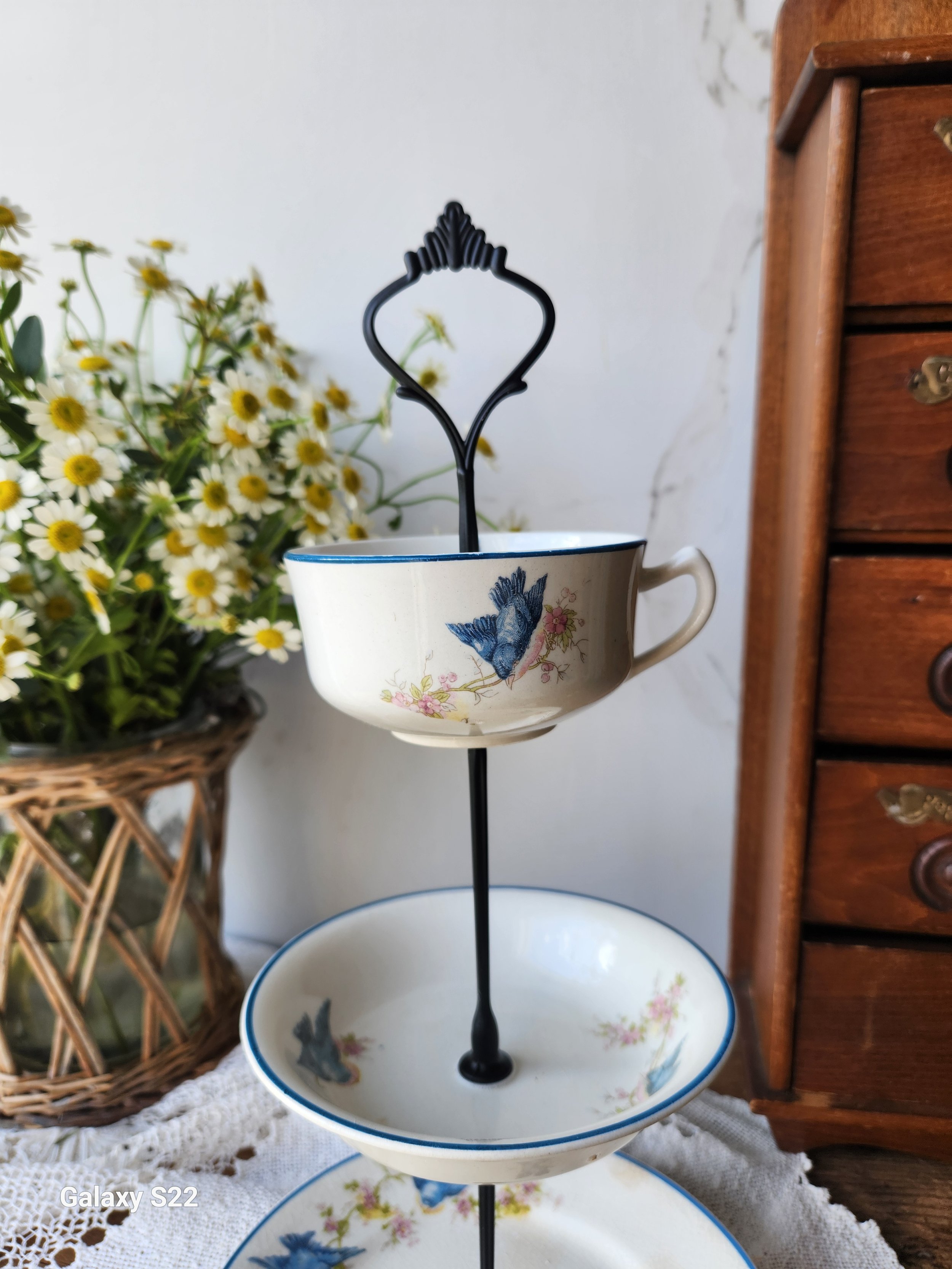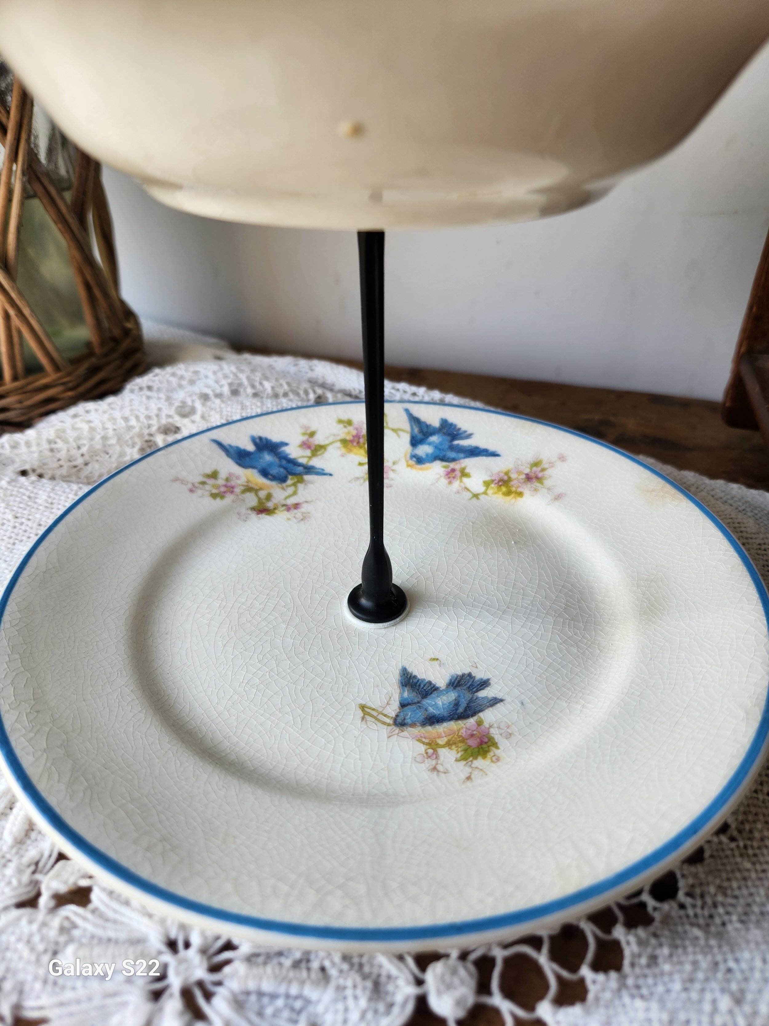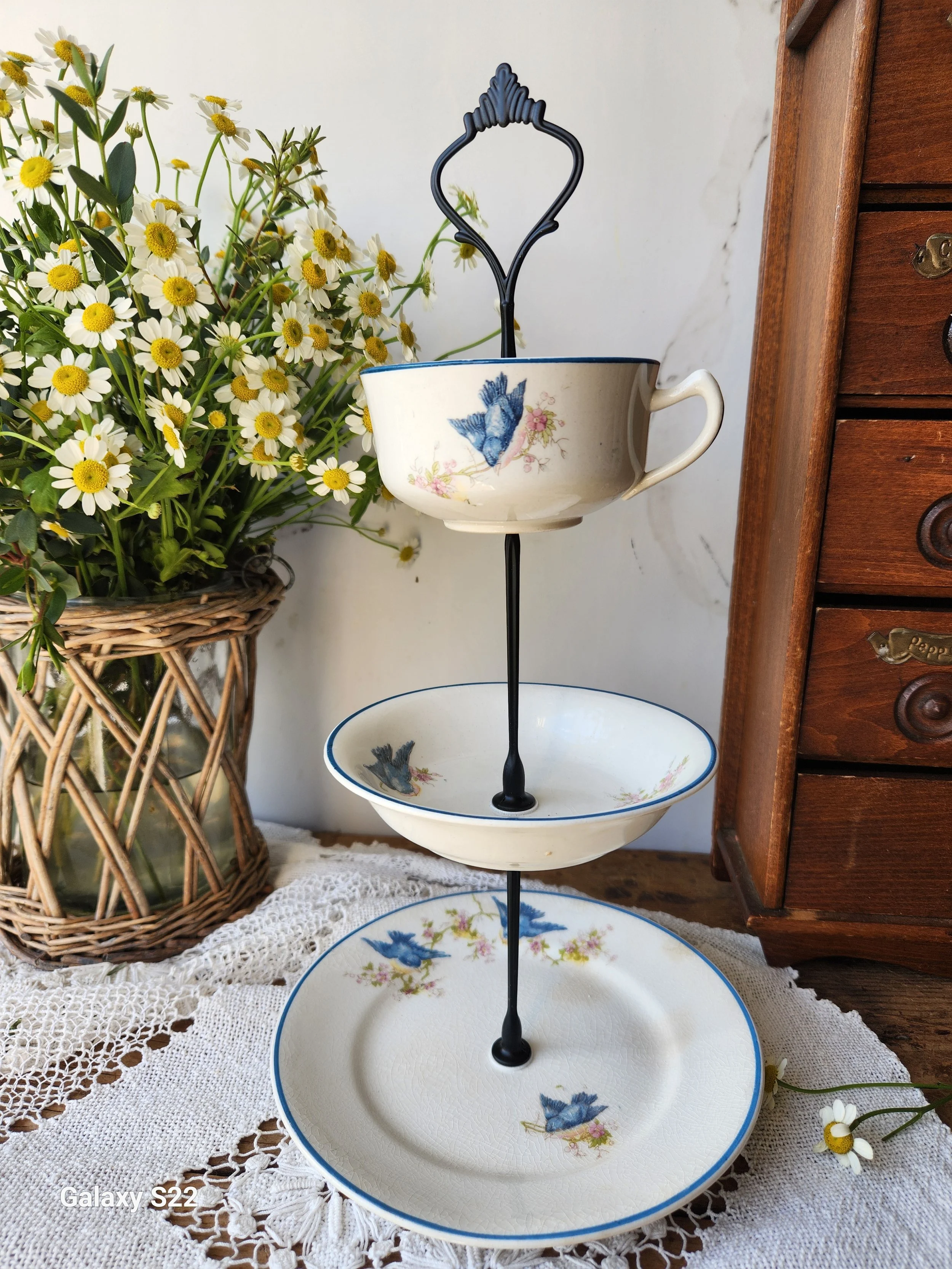 A lovely original design tiered tray set featuring a rare Blue Birds Homer laughlin stamped ironstone pair of plates i drilled holes into and has a iron hardware set! Ships disassembled for safe shipping and easy assembly! A wonderful addition to your home and so versatile! Use beside a sink, on a bedside table or desk or for hosting! 8x14