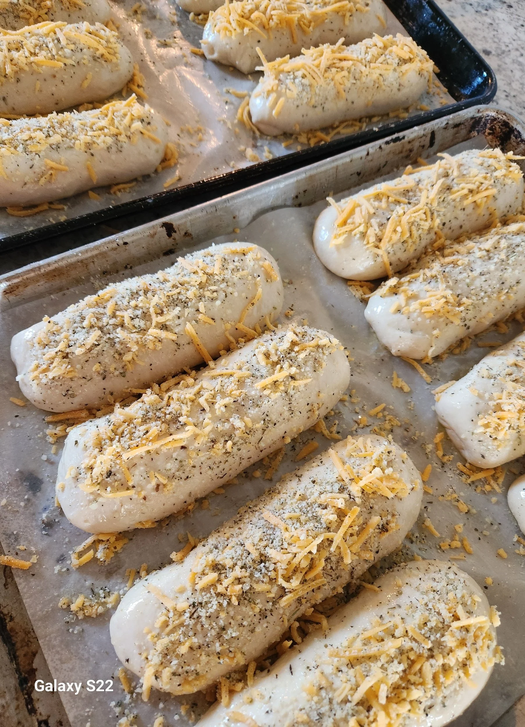Divide the dough into 16 equal balls. Shape each ball into a log shape. I placed 8 subs on each cookie sheet on parchment paper, evenly spaced.